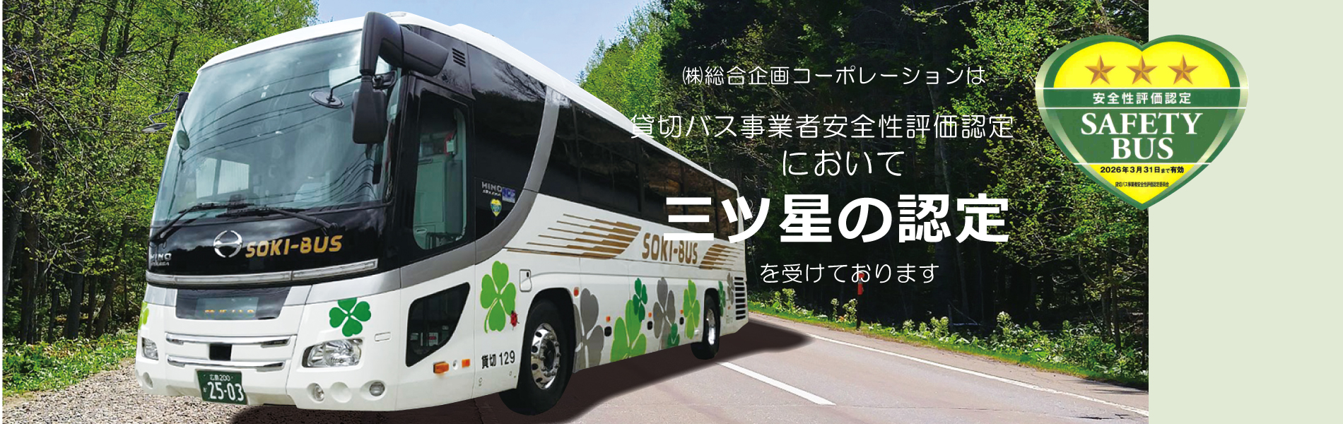 2024年1月30日 / 最終更新日時 : 2025年7月8日 owner お知らせ 貸切バス事業者安全性評価「三ツ星認定」 安全に取り組む優良な貸切バス事業者を認定する 「貸切バス事業者安全性評価認定」において、 ㈲総合企画コーポレーションは、 最高ランクの三ツ星認定を受けました。 これからも日々安全運輸に努め、 皆さまに安心してご利用いただ […]
